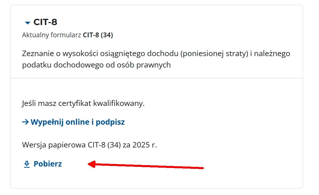 Aktualnie (2026) udostępnionym, internetowym formularzem CIT-8 jest wersja 34, do której, w razie potrzeby, automatycznie dołączane są załączniki CIT-8/O i CIT-D.