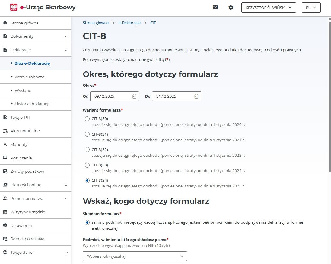 Wypełnianie internetowego formularza CIT-8 zaczyna się od wskazania okresu, za który sporządzane jest zeznanie (rok podatkowy) - w większości przypadków jest to pierwszy i ostatni dzień ubiegłego roku kalendarzowego.