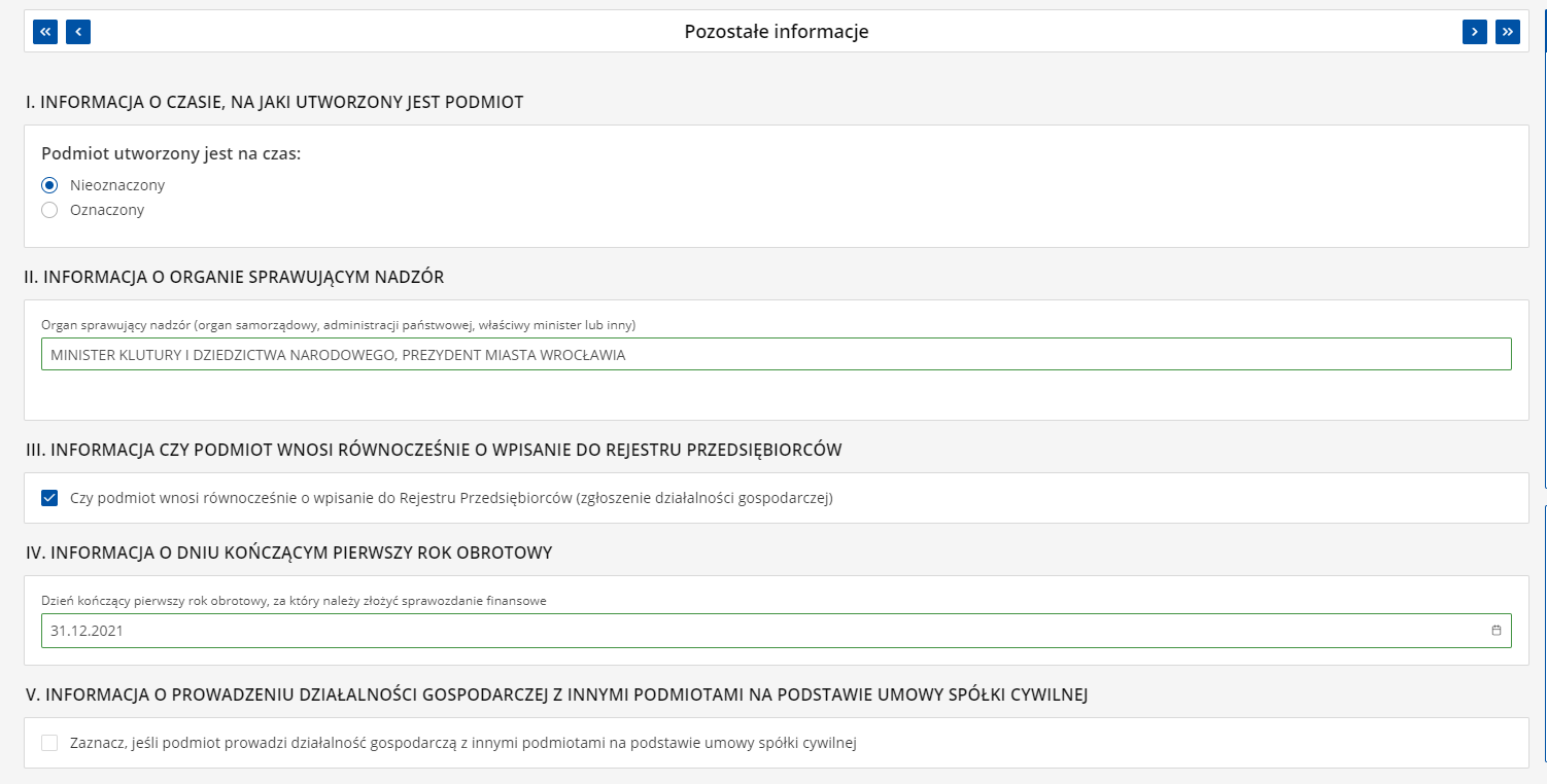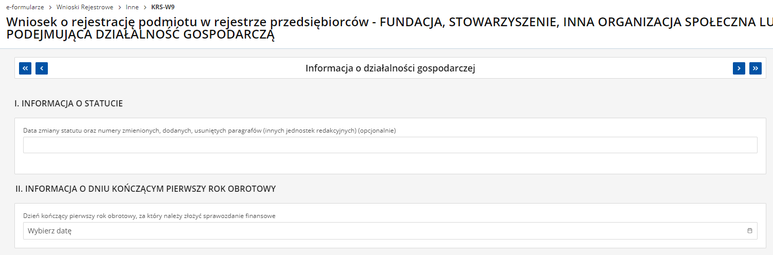 - dzień i miesiąc zakończenia pierwszego roku obrotowego. Przykładowo jeśli organizacja rejestruje się w lipcu 2021 roku, to jako datę zakończenia pierwszego roku obrotowego może podać 31.12