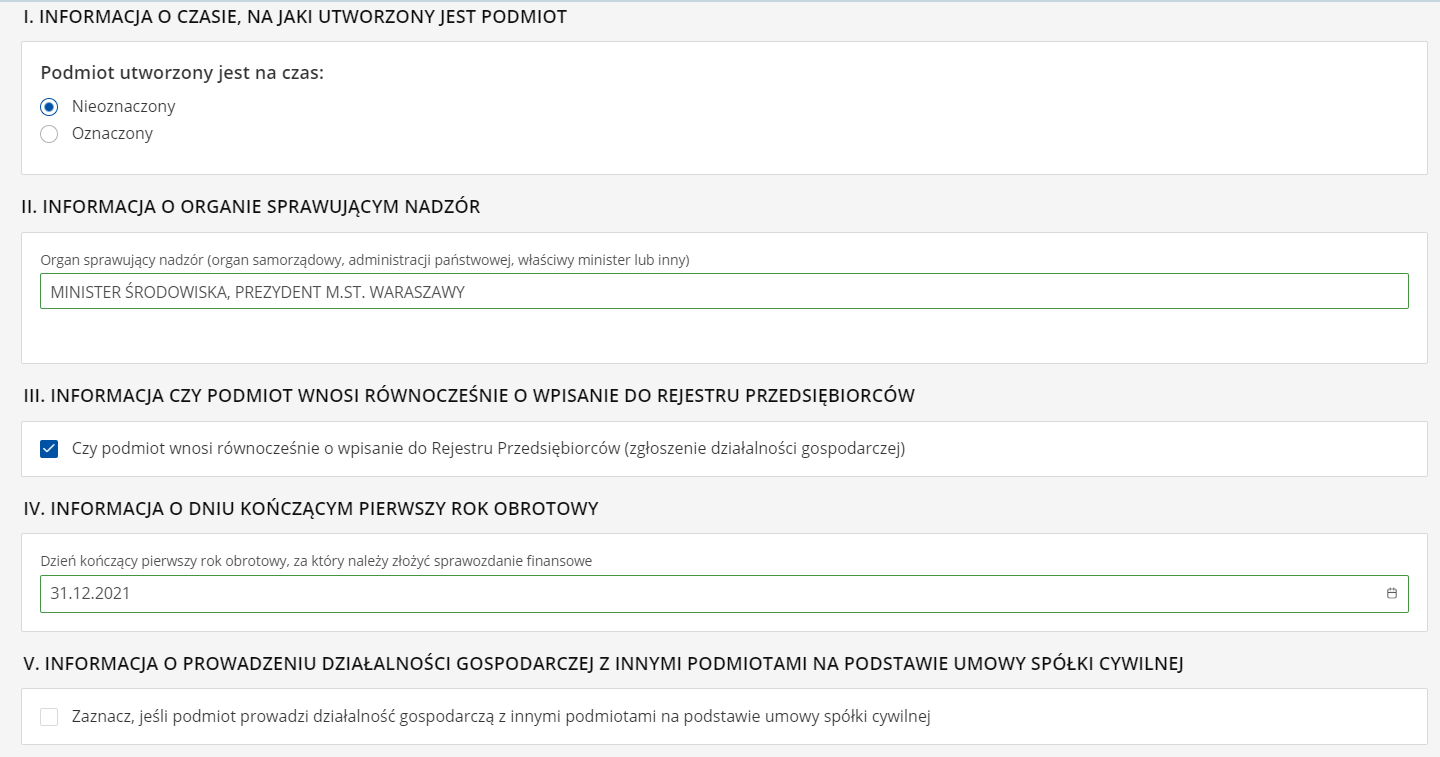 - dzień i miesiąc zakończenia pierwszego roku obrotowego. Przykładowo jeśli fundacja rejestruje się w lipcu 2021 roku, to jako datę zakończenia pierwszego roku obrotowego może podać 31.12