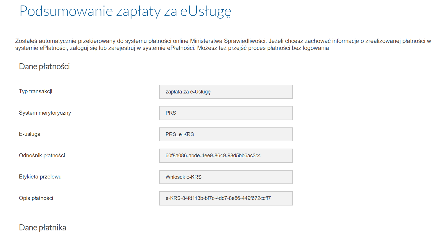 - bezpośrednio poprzez Portal Rejestrów Sądowych. Po kliknięciu "opłacenie wniosku" następuje przekierowanie do systemu płatności.