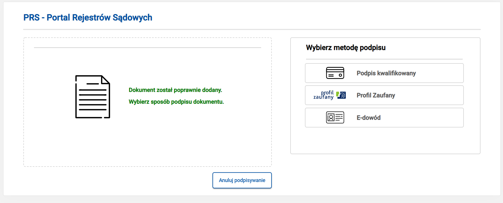 Wniosek o rejestrację organizacji jest podpisywany przez wszystkie osoby z zarządu. W związku z tym, wszystkie osoby muszą mieć zarejestrowane konto w Portalu Rejestrów Sądowych (PRS). Do podpisania można używać profilu zaufanego albo płatnego podpisu kwalifikowanego.